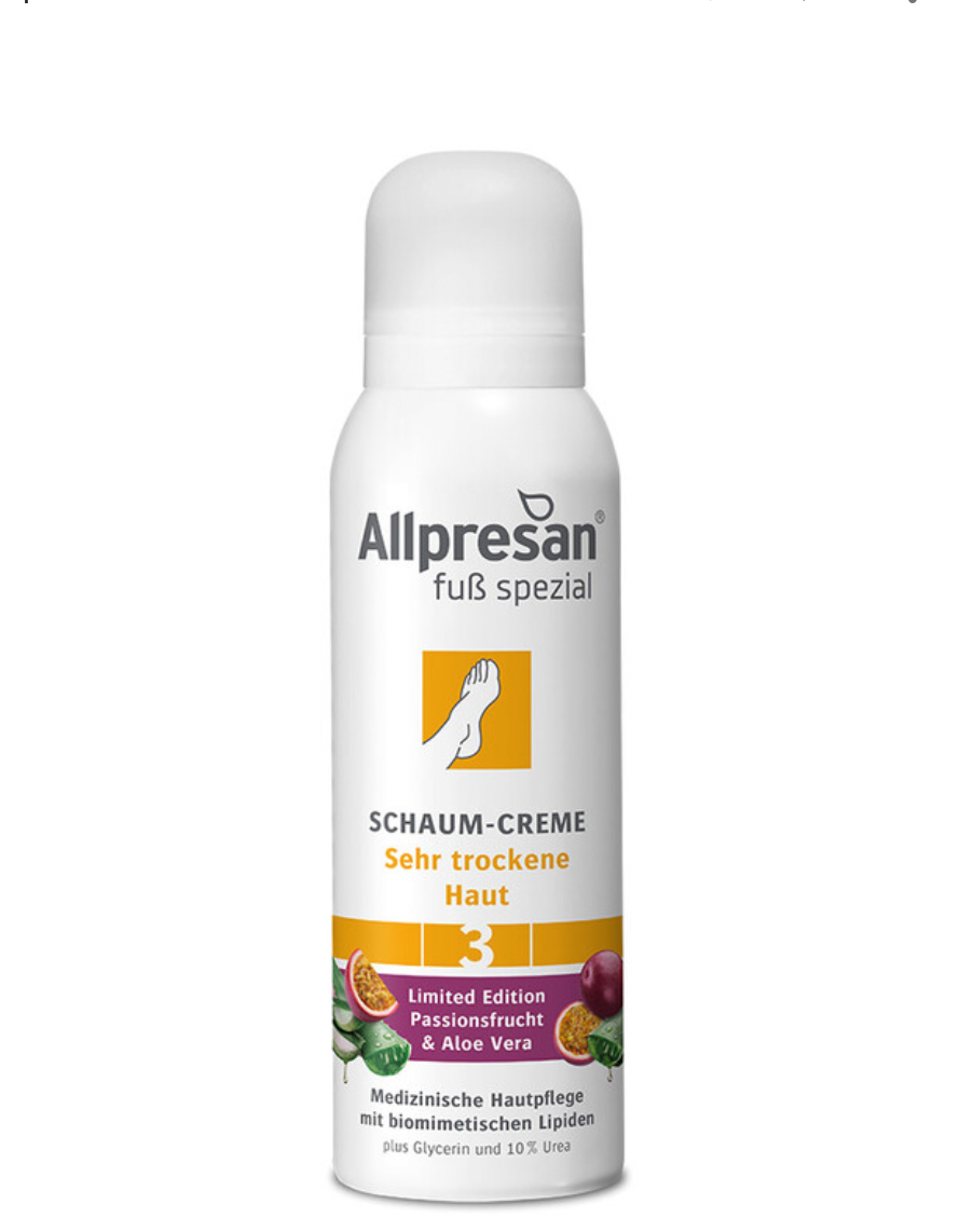 Die Allpresan Fuß spezial Nr. 3 Schaum-Creme ist eine effektive Lösung für intensive und langanhaltende Feuchtigkeit, die speziell für sehr trockene Haut am Fuß entwickelt wurde. Mit 10 % Urea hilft diese Schaum-Creme, Hautrauigkeit, Rissigkeit und Verhornungen zu reduzieren und bietet eine intensive Pflege, um die Haut weich und geschmeidig zu halten.